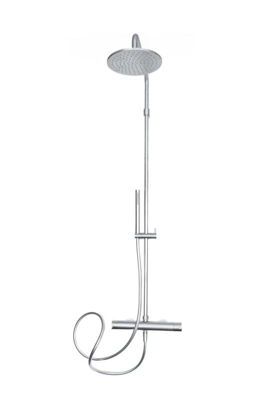 Tuš kombinacija je izdelana iz visokokakovostnega medenine in obdelana s trajnim kromiranim premazom. To zagotavlja luksuzen videz, odlično odpornost proti obrabi in dolgotrajno zanesljivost. Zahvaljujoč termostatskemu mešalnemu ventilu ostane temperatura vode stabilna, tudi pri spreminjajočem se tlaku vode.